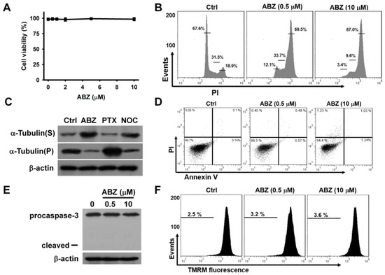 Treatment with ABZ at quantities ranging from 0.5 μM to 10 μM for 24 h did not appreciably reduce the survival of K562 cells (Figure 1A) Treatment with either 0.5 or 10 μM ABZ notably increased the cell population arrested at G2/M phase of the cell cycle, while ABZ-treated cells did not show an appreciable increase in the cell population at sub-G1 area (Figure 1B). As shown in Figure 1C, both ABZ and nocodazole treatments suppressed tubulin polymerization, as evidenced by an increase in cytosolic α-tubulin (S fraction). The treatment of K562 cells with paclitaxel induced tubulin polymerization and thus increased the amount of α-tubulin in cytoskeletal (pellet, P) fractions. The ABZ-induced microtubule-destabilizing effect caused a G2/M cell cycle arrest. An annexin V/PI staining assay showed that treatment with ABZ did not appreciably induce apoptosis in K562 cells (Figure 1D). Additionally, ABZ-treated cells did not show the degradation of procaspase-3 or the loss of mitochondrial membrane potential (ΔΨm) (Figure 1E,F). These results indicate that mitotic arrest induced by ABZ did not immediately activate the apoptotic pathway in K562 cells.