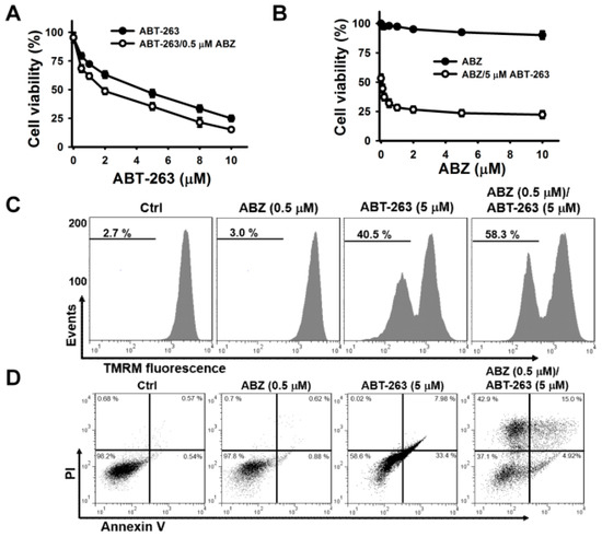 After incubation of 10 μM H2DCFDA for 20 min, the intracellular ROS level of ABZ-treated cells was measured using a fluorescence microplate reader. MitoSOX Red probe was used to detect mitochondrial ROS level in ABZ-treated cells, and the MitoSOX Red-labeled cells were analyzed using flow cytometry. After incubation with 2 nM TMRM for 20 min, the mitochondrial membrane potential (ΔΨm) of ABZ-treated cells was measured using flow cytometric analysis. A reduction in TMRM fluorescence represented the loss of ΔΨm.