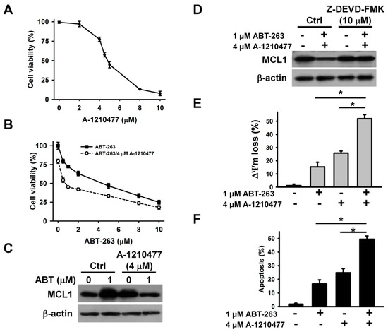 To further explore whether MCL1 suppression alone can cause the death of K562 cells, we examined the cytotoxicity of A-1210477 (an MCL1 inhibitor) on K562 cells. A-1210477 dose-dependently decreased the survival of K562 cells after 24 h of treatment (Figure 3A). Treatment with 4 μM A-1210477 caused an approximately 25% loss in K562 cell viability. To examine the enhancement of ABT-263 cytotoxicity when combined with A-1210477, the sub-lethal concentration of A-1210477 was used. Co-treatment with 4 μM A-1210477 markedly increased the cytotoxicity of ≤ 1 μM ABT-263 on K562 cells (Figure 3B). This finding aligns with previous studies, which show that A-1210477 synergizes with ABT-199 (a BCL2 inhibitor), to kill a variety of cancer cell lines [23]. Either A-1210477 or ABT-263 treatment increased MCL1 protein expression in K562 cells (Figure 3C). Similarly, previous studies have shown that ABT-263 upregulates MCL1 expression in cancer cells [21], while A-1210477 increases MCL1 accumulation, due to the inhibition of NOXA-mediated MCL1 degradation [23]. Nevertheless, co-treatment with A-1210477 and ABT-263 reduces MCL1 expression in K562 cells. Studies by Ryu et al. [24] have reported a caspase-mediated MCL1 cleavage in ABT-737-treated leukemia cells. Consistent with these findings, the present study found that treatment with a caspase-3 inhibitor restored MCL1 expression (Figure 3D). Compared to either A-1210477 or ABT-263, the combinatorial treatment increased the loss of ΔΨm and apoptosis in K562 cells (Figure 3E,F).