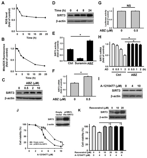 ABZ induced SIRT3 upregulation in K562 cells. Without specific indication, K562 cells were treated with 0.5 μM ABZ for 24 h. (A) ABZ induced a reduction in ROS generation. K562 cells were incubated with ABZ for indicated time periods. Results were shown as fold-increase in fluorescence intensity compared with the control group. Each value is the mean ± SD of three independent experiments with triplicate measurements. ROS was quantified by the fluorescence plate reader. (B) Measurement of mitochondrial ROS generation using mitochondrial superoxide probe MitoSOX Red. K562 cells were incubated with ABZ for indicated time periods. The data represent the mean ± SD. Effect of ABZ induced SIRT3 expression in (C) concentration- and (D) time-dependent manners. (E) Effect of ABZ on SIRT3 deacetylase activity in K562 cells. A control experiment was also conducted using 5 mM suramin (a SIRT inhibitor), provided in the kit. Data represent mean ± SD (* p < 0.05). (F) Analysis of SIRT3 mRNA levels in ABZ-treated cells. The values represent averages of three independent experiments with triplicate measurements (mean ± SD, * p < 0.05). (G) Effect of ABZ on the luciferase activity of SIRT3 promoter construct. SIRT3 promoter construct-transfected cells were treated with ABZ for 24 h and then harvested for measuring luciferase activity (NS, statistically insignificant). (H) Effect of ABZ on SIRT3 mRNA stability. Cells were treated with or without ABZ for 24 h, and then incubated with 10 μg/mL actinomycin D (AD) for the indicated time periods. The level of SIRT3 mRNA was analyzed by qPCR. ABZ-untreated and ABZ-treated cells without actinomycin D treatment were used as control (mean ± SD, * p < 0.05). (I) Effect of A-1210477 on SIRT3 expression in K562 cells. K562 cells were treated with indicated A-1210477 concentrations for 24 h. (J) SIRT3 overexpression increased the viability of A-1210477-treated cells. After transfection with an empty vector or pCMV3-His-SIRT3 for 24 h, the transfected cells were treated with indicated A-1210477 concentrations for 24 h. Cell viability was determined using MTT assay (mean ± SD, * p < 0.05). (Inset) Western blot analysis of SIRT3 expression in pCMV3-His-SIRT3-transfected cells. (K) Effect of resveratrol on the viability of A-1210477-treated cells. K562 cells were treated with indicated resveratrol concentrations for 1 h, and then incubated with 4 μM A-1210477 for 24 h (mean ± SD, * p < 0.05). (Inset) Effect of resveratrol on SIRT3 expression.
