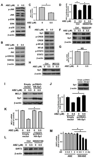 Some studies have revealed that Akt and MAPK actively regulate MCL1 transcription, and Akt-modulated GSK3β phosphorylation is crucial for MCL1 degradation [27,28]. Thus, we sought to analyze the phosphorylation of MAPK, Akt, and GSK3β in ABZ-treated cells. ABZ treatment increased p38 MAPK phosphorylation, but did not alter p-ERK or p-JNK levels (Figure 5A). Meanwhile, neither the phosphorylation of Akt nor GSK3β was affected by ABZ treatment (Figure 5B). The treatment of ABZ reduced MCL1 mRNA levels and promoter luciferase activity (Figure 5C,D). These results suggest that ABZ downregulates MCL1 expression via inhibition of MCL1 transcription. Previous studies have reported the involvement of the transcriptional factors Sp1, STAT3, NFκB, and CREB in MCL1 transcription [29,30,31]. ABZ treatment induced Sp1 downregulation, but did not affect CREB, STAT3, or NFκB phosphorylation or expression (Figure 5E). The inhibition of p38 MAPK by SB202190 increased MCL1 and Sp1 expression in ABZ-treated cells (Figure 5F). Furthermore, SB202190 mitigated the inhibitory effect of ABZ on MCL1 promoter luciferase activity (Figure 5D). ABZ treatment did not significantly affect the levels of Sp1 mRNA (Figure 5G). The inhibition of proteasome by MG132 restored Sp1 expression (Figure 5H), suggesting that ABZ induces Sp1 degradation. The ectopic expression of Sp1 eliminated the effect of ABZ on the suppression of MCL1 expression and promoter luciferase activity (Figure 5I–K). These results emphasize that ABZ inhibits MCL1 transcription through p38 MAPK-mediated Sp1 degradation. In agreement, the nucleotide sequence of MCL1 promoter region contains a Sp1-binding site at positions from −167 to −159 [29]. Notably, pretreatment with SB202190 decreased SIRT3 expression and mRNA stability in cells exposed to ABZ (Figure 5L,M). These findings suggested that ABZ-elicited p38 MAPK activation causes MCL1 suppression and SIRT3 upregulation concurrently.