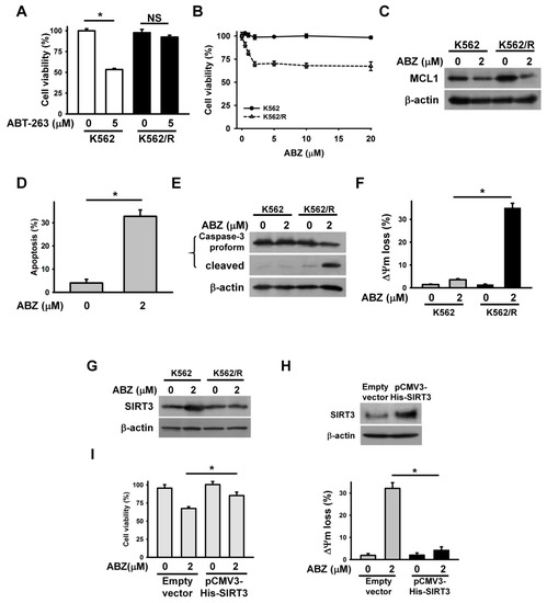 Accumulated evidence shows that MCL1 expression confers tumor cells resistance to ABT-263 [21,22]. For this reason, the cytotoxicity of ABZ on ABT-263-resistant cancer cells is an interesting and relevant topic in the field of cancer research. ABT-263-resistant K562 cells (K562/R) were prepared by continuous exposure of parental K562 cells to 5 μM ABT-263. The K562/R cells remained alive after ABT-263 treatment for 24 h (Figure 6A). Notably, ABZ showed higher cytotoxicity on K562/R cells than on parental cells (Figure 6B). The treatment of K562/R cells with 2 μM ABZ for 24 h caused an approximate 25% loss in cell viability. Thus, we used this concentration of ABZ to investigate its cytotoxicity on K562/R cells. Immunoblotting showed that K562/R cells had higher MCL1 expression than K562 cells (Figure 6C). Treatment with ABZ similarly downregulated MCL1 in parental and K562/R cells. An annexin V-PI staining assay showed that ABZ induced the apoptosis of K562/R cells (Figure 6D). Similarly, ABZ-treated K562/R cells produced cleaved caspase-3 (Figure 6E) and the dissipation of ΔΨm (Figure 6F). In contrast to K562 cells, K562/R cells did not show SIRT3 upregulation after ABZ treatment (Figure 6G). The ectopic expression of SIRT3 reduces the loss of ΔΨm in ABZ-treated K562/R cells (Figure 6H) and increased the survival of ABZ-treated K562/R cells (Figure 6I). These results indicate that MCL1 suppression elicits the apoptosis of ABZ-treated K562/R cells when SIRT3 expression is not altered.