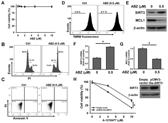 To examine whether SIRT3 also inhibited the cytotoxic effect of ABZ-induced MCL1 suppression in other cell lines, we analyzed the cytotoxicity of ABZ on human leukemia MEG-01 cells. As shown in Figure 7A, ABZ did not appreciably reduce the survival of MEG-01 after 24 h treatment. Treatment with 0.5 μM ABZ notably increased the cell population arrested at G2/M phase of the cell cycle, but did not induce apoptosis and ΔΨm loss in MEG-01 cells (Figure 7B–D). ABZ treatment increased SIRT3 expression and decreased MCL1 expression in MEG-01 cells (Figure 7E). Consistently, ABZ-treated MEG-01 cells showed an increase in SIRT3 mRNA expression and a reduction in MCL1 mRNA expression (Figure 7F,G). Overexpression of SIRT3 attenuated the A-1210477-induced death of MEG-01 cells (Figure 7H). These findings suggest that SIRT3 upregulation protects MEG-01 cells from the cytotoxicity of MCL1 suppression.