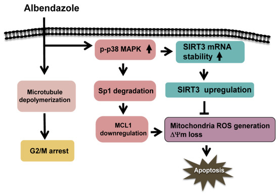 Signaling pathways elucidate the protective effect of SIRT3 upregulation on the cytotoxicity of ABZ-induced MCL1 suppression in K562 cells. ABZ treatment simultaneously induces microtubule depolymerization, MCL1 downregulation, and SIRT3 upregulation in K562 cells. ABZ inhibits MCL1 transcription through p38 MAPK-mediated Sp1 degradation. Meanwhile, ABZ-induced p38 MAPK activation increases the stability of SIRT3 mRNA and SIRT3 protein expression in K562 cells. SIRT3 upregulation delays ABZ-induced apoptosis in K562 cells when ABZ inhibits MCL1 expression. Thus, SIRT3 expression modulates the capability of ABZ to induce apoptosis in K562 cells.