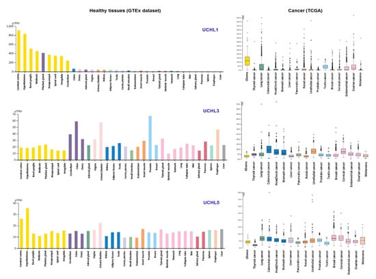 The expression analysis of ubiquitin C-terminal hydrolases (UCHs) UCH-L1, UCH-L3, and UCH-L5 in healthy tissues and in 17 cancer types. The expression analysis of UCH-L1, UCH-L3, UCH-L5 in 34 healthy tissues extracted from GTEx database. The expression is represented with TPM (tags per million clean tags). The clear enrichment of UCH-L1 in CNS and equal distribution of UCH-L3, UCH-L5 in all tissue types is shown (Left panel). The expression analysis of UCH-L1, UCH-L3, UCH-L5 in 17 cancer types extracted from The Cancer Genome Atlas (TCGA) project (https://portal.gdc.cancer.gov/). Boxplot indicates gene expression fragments per kilobase of exon per million reads (FPKM) in cancer samples (Right panel).