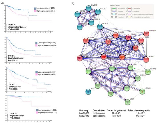 Survival analysis for UCHs in cancer types (for TCGA) and pathway enrichment analysis. (A) UCH-L1 as prognostic indicator for the unfavorable outcome in the endometrial and urothelial cancer, while UCH-L3 and UCH-L5 is associated with poor survival in liver and thyroid cancer. Survival difference analysis was done with log-rank test in a Kaplan–Meier survival model. (B) Pathway enrichment of UCHs and their functional partners constructed by the String tool is shown. Only the experimentally tested interaction was used for cluster formation, and two main pathways involved in the proteasome and spliceosome are also shown (KEGG ID: hsa03050 and hsa03040).
