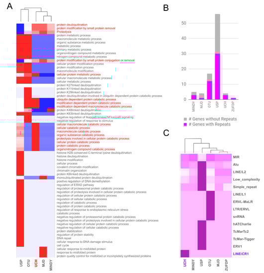 Functional and structural analysis of the deubiquitinating enzymes (DUBs) genes. (A) Gene ontological categories associated with each subfamily of DUBs, a hierarchical tree connects the subfamilies and the heat map shows the highest (red) and lowest (blue) associated categories. (B) Absolute frequency of DUB subfamilies with repeats in the upstream promoter region. (C) Heatmap of correlation between DUB subfamilies and types of repeats (dark purple shows high association).
