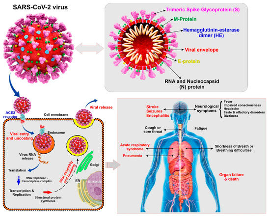 Coronaviruses belong to the subfamily Coronavirinae (family Coronaviridae; order Nidovirales), containing four genera named, Alphacoronavirus, Betacoronavirus, Gammacoronavirus, and Deltacoronavirus [9]. SARS-CoV-2 is a Betacoronavirus closely related to other human pathogenic coronaviruses SARS-CoV and MERS-CoV that also emerged in the 21st century [10]. SARS-CoV-2 is an enveloped and non-segmented single-stranded positive-sense RNA virus having crown like spikes on the outer surface. The diameter and length of SARS-CoV-2 are about 65–125 nm and 29.9 kb respectively [11,12]. Structure of SARS-CoV-2 consists of 4 major proteins namely, spike (S) glycoprotein, envelope (E) glycoprotein, membrane (M) glycoprotein, and nucleocapsid (N) protein, as well as several non-structural and accessory proteins (see Figure 1). Among all the proteins, the spike (S) protein plays a key role in viral attachment, fusion, entry, and transmission. This S protein is responsible for the entry of SARS-CoV-2 into the host cell by attaching with angiotensin converting enzyme 2 (ACE2), which acts as a receptor and is present in different organs of the body [13,14].