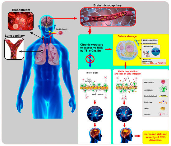 Furthermore, tobacco smoke also generates a high amount of superoxide, hydrogen peroxide, hydroxyl radical, and peroxynitrite, which exposes endothelial cells to highly reactive oxygen species (ROS), leading to oxidative stress (OS) damage [110]. OS ultimately results in lipoperoxidation of polyunsaturated fatty acids in membrane lipids, protein oxidation (backbone fragmentation), DNA breakdown [111,112,113], mutations of the nuclear protein p53, carcinogen-mediated DNA damage, RNA oxidation, mitochondrial depolarization, dysregulation of iron transporters and detoxifying enzymes, and apoptosis [28,114]. These pathological effects may further impair the cerebrovascular integrity and function, along with other factors or infectious agents that affect BBB [28,74,75,100,101].