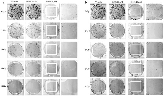 Cells were seeded in a 6-well plates in triplicate at a density of 80–420 cells/cm2, according to the dose delivered and to the vehicle or drug concentration. Then, irradiation was performed using the dose values of 2, 4, 6 and 8 Gy. After irradiation, cells were incubated for 7–10 days in normoxia and hypoxia condition until the colony formation. The colonies were incubated with 0.05% crystal violet diluted in 20% ethanol (Saint Quentin Fallavier, France) for 30 min at room temperature. SF was determined according to the plating efficiency (PE) as we previously described [9]. Briefly, we calculated the PE, dividing the counted colony by the total plated cells. We then calculated the SF as a ratio of sample PE over control PE. For each experiment, the effect of each dose of radiation alone and combined with Si306 was evaluated on three individual wells of cell culture and each experiment was performed in triplicate.