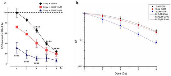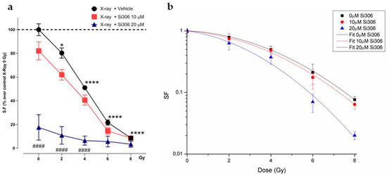 SF of irradiated cells with Si306 exposure in hypoxia. (a) Mean ± SEM, three independent experiments; **** p-value < 0.0001 versus 0 Gy in normoxia; # p-value < 0.05 and #### p-value < 0.0001 versus X-rays + vehicle at the same dose (FSi306conc. = 34.09, p-value < 0.0001; FGy = 77.95, p-value < 0.0001; FSi306conc. x Gy = 3.929, p-value = 0.0012. Two-way ANOVA with Holm–Šídák post-hoc test). (b) Linear-quadratic adjustment of the data of U251 cell survival curves treated with X-rays only and combined with Si306 in hypoxia.