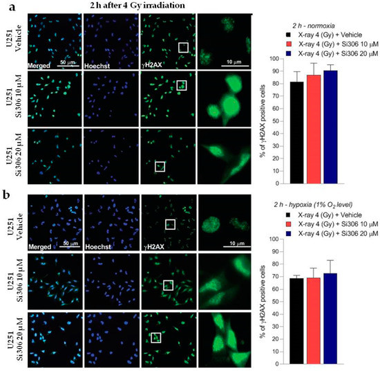 Representative pictures with inserts (white squares) and quantification of U251-MG positive cells for γH2AX performed 2 h after 4 Gy irradiation in normoxia (a) and hypoxia (b). Data are mean ± SD of n = 3 independent experiments; 4 Gy + vehicle; (Fnormoxia = 2.030, p-value = 0.1564; Fhypoxia = 0.5685, p-value = 0.5798. One-way ANOVA with Holm–Šídák post-hoc test).