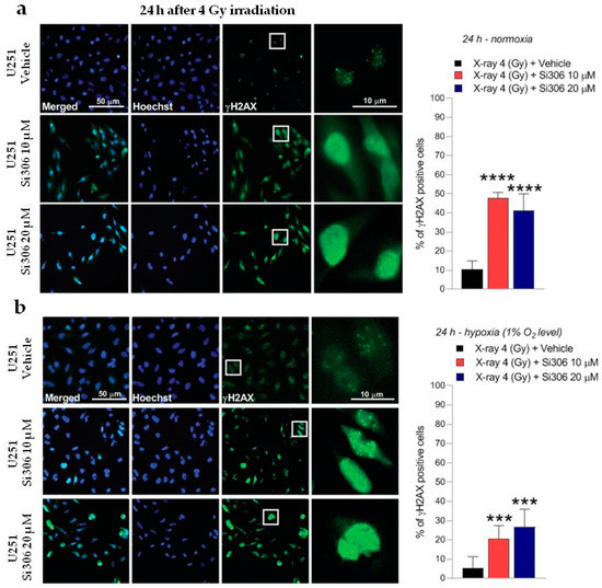 Representative pictures with inserts (white squares) and quantification of U251-MG positive cells for γH2AX realized 24 h after 4 Gy irradiation normoxia (a) and in hypoxia (b). Data are mean ± SD of n = 3 independent experiments; *** p-value < 0.001 and **** p-value < 0.0001 versus 4 Gy + vehicle (Fnormoxia = 87.81, p-value < 0.0001; Fhypoxia = 18.87, p-value < 0.0001. One-way ANOVA with Holm–Šídák post-hoc test).