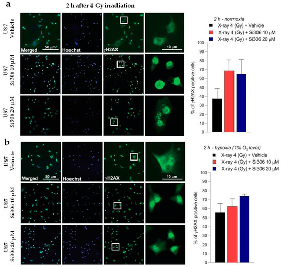 The DNA damage was evaluated by γH2AX immunofluorescence during the maximum of foci formation and also damage repair capacity (2 and 24 h after X-ray radiation, respectively) [9]. Immunofluorescence analyses showed that in normoxia and hypoxia, the exposure to Si306 in combination with irradiation led to a signal increase that was not significant 2 h after irradiation compared to X-rays only (Figure 5a,b). The synergistic effect of the Si306 molecule with IR became significant 24 h after treatment, where the foci signal was maintained at high levels in the case of combined treatment, compared to irradiation alone: 48 % and 41% of U251 cells, exposed, respectively, with 10 µM and 20 µM of Si306, were still positive compared to 10% of only irradiated U251 cells in normoxia. More interestingly, in hypoxia we showed a persistence of 21% and 27% positive U251-MG cells, both irradiated and exposed to 10 µM Si306 and 20 µM of Si306, respectively, compared to 5% of only irradiated cells (Figure 6a,b). To further confirm this observation, the immunofluorescence assay was repeated on the U87-MG GBM cell line. The results obtained were similar, since the differences in the foci γH2AX signal between the treatment conditions with vehicle and with Si306 were not significant 2 h after irradiation (Figure 7a,b). The increase in foci γH2AX expression was statistically significant only 24 h after irradiation in the combined treatments: In normoxia, after irradiation and Si306 pre-treatment, 35% (10 µM) and 31% (20 µM) of U87 cells were positive versus 15% of only irradiated U87 cells; similar results were obtained in hypoxia, since 18% and 28% of irradiated and Si306 pre-treated U87 cells, respectively, with 10 µM and 20 µM, were positive compared to 10% of only irradiated U87 cells (Figure 8a,b).