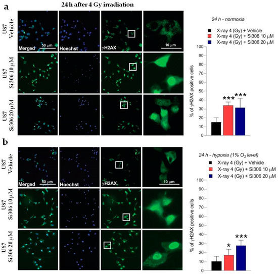 Representative pictures with inserts (white squares) and quantification of U87 positive cells for γH2AX realized 24 h after 4 Gy irradiation in normoxia (a) and hypoxia (b). Data are mean ± SD of n = 3 independent experiments; * p-value < 0.05 and *** p-value < 0.001 versus 4 Gy + vehicle (Fnormoxia = 16.82, p-value < 0.0001; Fhypoxia = 12.77, p-value = 0.0004. One-way ANOVA with Holm–Šídák post-hoc test).