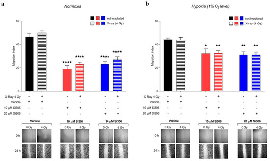 Cells were seeded in 24 multiwell plates and incubated at both normoxic and hypoxic conditions. Following cell adhesion, Si306 molecule was added for 24 h. Mitomycin C (3 µL/mL, Saint Quentin Fallavier, France) was used to block cell proliferation. Samples were irradiated with 4 Gy, and immediately after the irradiation a horizontal scratch was created using a sterile tip in the center of the cell monolayer. After 24 h samples were washed with PBS to remove floating cells and were stained with crystal violet solution as mentioned above. Images were acquired at 0 hand 24 h post-scratch and the area between scratch edges was quantified. The scratch wound closure percentage was calculated as follows: The scratch area 0 h – the scratch area 24 h / (the scratch area 0 h) × 100%.