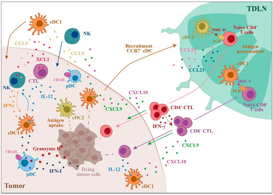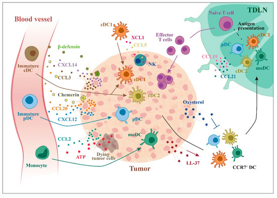Tumor infiltrating cDCs derive from a bone marrow precursor (pre-cDC) that migrate from blood to tumor to differentiate in proliferating cDCs. In different transplantable tumor models, this process was shown to be largely driven by the tumor expression of CCL3, a ligand of CCR1 and CCR5, two chemokine receptors expressed by pre-cDCs [120]. However, tumor moDCs may also develop and function independently of pre-cDC-derived DCs [74], as already differentiated circulating cDC1s may accumulate in the TME in response to the production of CCL5 and XCL1 by tumor-infiltrating NK cells, CD8+ T cells, and innate lymphoid cells [42]. While chemokines, such as CCL5, may also recruit cells that promote tumor growth, such as Treg and macrophages [121,122], XCL1 is a specific chemoattractant for cDC1s [123,124] and this chemokine could be exploited in cDC1-targeted therapies [125]. Many tumors also produce CCL20, as documented in primary breast carcinoma [126], renal carcinomas, and thyroid papillary carcinoma [127,128,129].