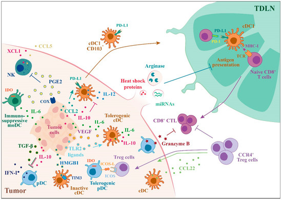 DCs can favor tumor growth and progression by promoting immune tolerance [75] (Figure 2). Within the TME, several soluble factors can upregulate transcriptional and metabolic pathways permissive for the generation of DC tolerogenic phenotype, such as IL-10, IL-6, PGE2, VEGF, and colony stimulating factor-1 (CSF-1). VEGF was one of the first identified factors produced by tumor cells described to inhibit DC functions, including differentiation from precursors, activation, and recruitment to the tumor site [76,77,78]. IL-10 production by tumor-associated macrophages can suppress the expression of the anti-tumor cytokine IL-12 by CD103+ cDC1s. IL-10 receptor blockade, in combination with CSF-1 inhibition, was shown to reduce metastatic burden and to improve the efficacy of paclitaxel therapy [39]. In addition, DCs may by themselves produce inhibitor factors. Tumor-derived TLR2 ligands were shown to be critical for the generation of immunosuppressive IL-6- and IL-10-producing DCs [79]. The Wnt/β-catenin activation in tumor cells has been variously implicated in the suppression of DC functions by paracrine IL-10 production and the downregulation of CCL4, a chemokine responsible for the recruitment of CD103+ cDC1s [28]. Within the TME, DCs are the main producers of CCL22, a chemokine that regulates the migration of CCR4+ Treg cells [80,81]. Treg-DCs interaction at the tumor site is critical for the local suppressive functions of Treg [82,83]. Tumor-intrinsic upregulation of COX activity and PGE2 production may be responsible for impaired NK cell recruitment and the consequent reduction of CCL5- and XCL1-mediated intratumoral cDC1 and CTL infiltration [42,84]. The enzyme indoleamine 2,3 dioxygenase (IDO) is upregulated in tumor-associated DCs. IDO-expressing DCs consume tryptophan, an essential aminoacid for effector T cell functions, promoting Treg differentiation [85]. Tumor-derived lactic acid was recently shown to impair DC functions in lung cancer [86]. The abnormal accumulation of lipids is a major mechanism involved in DC dysfunction, in particular in cross-presentation, as shown in several preclinical models and cancer patients [87,88]. In ovarian cancer, DCs engulfed with lipid droplets showed robust activation of the endoplasmic reticulum stress response factor XBP1. This pathway is responsible for triglyceride metabolism and accumulation of intracellular lipids, a mechanism that makes DCs unable to induce antitumor responses [89].