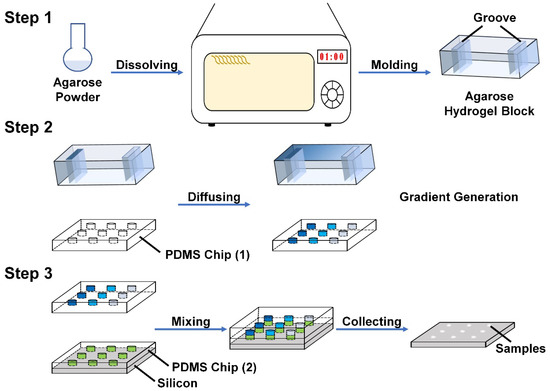 The key aim of this screening platform is to form a reagent concentration gradient inside the holes in PDMS chips. A hydrogel block with two grooves was required and by adding high-concentration solution of reagent A in the left groove and adding low-concentration solution of reagent A in the right groove, reagent A could diffuse through the hydrogel block from left to right and a stable concentration gradient of reagent A could be generated inside the hydrogel block after a sufficient diffusion time, as well as cylindrical holes in the square array in the PDMS chip (1) (as displayed in Figure 1). The procedure of fabricating the hydrogel block is shown in step 1 of Figure 1. The hydrogel block was formed in a PCL frame and a Teflon base (Figure S3B in the supplementary materials), and a 3D modeling diagram of the application of the Teflon base and PCL frame is provided in Figure S3A, where the translucent grey part represents the PCL lid (dimensions of 5.6 × 8.6 × 2.5 cm3) and the outframe (inner dimensions of 5 × 8 × 2.5 cm3), while the yellow part represents the Teflon base with two rectangular convex plates (dimensions of 40 × 10 × 7 mm3) to form the two grooves in the hydrogel block. The distance between the two rectangular convex plates was 30 mm. The agarose powder was dissolved in deionized water by heating it in a microwave oven (Midea, Guangzhou, China) at 700 W for 3 min, which formed a 1.0 wt% agarose solution. Then, the solution was carefully transported to the combined PCL outframe and the Teflon base and was left to solidify when cooling to room temperature, which produced the hydrogel block. The distance between the two grooves (40 × 10 × 7 mm3) was 30 mm and the thickness of the hydrogel block was around 10 mm.