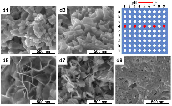 By placing the PDMS chip (1) containing 0.12 M ammonium phosphate dibasic [(NH4)2HPO4] and 0.50 M Na3Cit with a pH gradient from 13 to 7 across different columns of the holes array on the PDMS chip (2), which was fixed on a silicon wafer that contained 0.20 M calcium nitrate tetrahydrate [Ca(NO3)2·4(H2O)] solution, when the two solutions in different PDMS chips were brought into contact with each other, the reaction was immediately triggered, and calcium phosphates began to be generated inside the microreactors. Figure 2 shows the scanning electron microscope (SEM) images of the generated calcium phosphates’ structure on the silicon wafer and from left to right, the pH value changed from 13 to 7. As can be observed in Figure 2, apparently, the pH value of the reactant solution had a crucial influence on the morphologies of the calcium phosphates formed. When the pH value was relatively low, CaP exhibited a one-dimensional nanorod morphology with a length of about ~150–200 nm and a nanosheet morphology was observed when the pH value was increased, which then changed into a network structure formed by a large piece of thin flakes. Additionally, irregular nanoparticles were formed in a strong alkaline environment. Figure S4 in the supplementary materials shows the SEM images of the calcium phosphate structures generated at a3 and h3, and as can be observed, irregular nanoparticles were formed at a3, d3 (Figure 2), and h3, which proved the stability of the pH gradient in the same column.