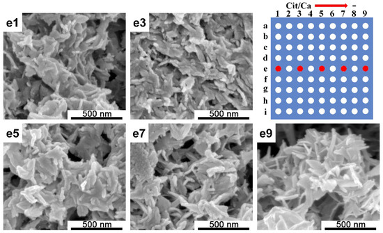 We also established a Na3Cit concentration gradient to explore the additive effect for calcium phosphate synthesis. By mixing the 0.20 M Ca(NO3)2 solution in the PDMS chip (2) with a mixed solution of 0.12 M (NH4)2HPO4 and the Na3Cit concentration gradient (varied from 0.5 to 0 M) in the PDMS chip (1), calcium phosphates were generated inside the microreactors and the morphologies of calcium phosphates indicated the influence of Cit3− during crystallization. As can be seen in Figure 3, under mild alkaline conditions, compared to the pH change, Cit/Ca variation (from 0 to 2.5) did not significantly affect the CaP morphologies; as the concentration of citrate increased, the particles transformed from loose thorn-like structures to dense short rod-like structures, and finally, rod-like and sheet-like structures were obtained.