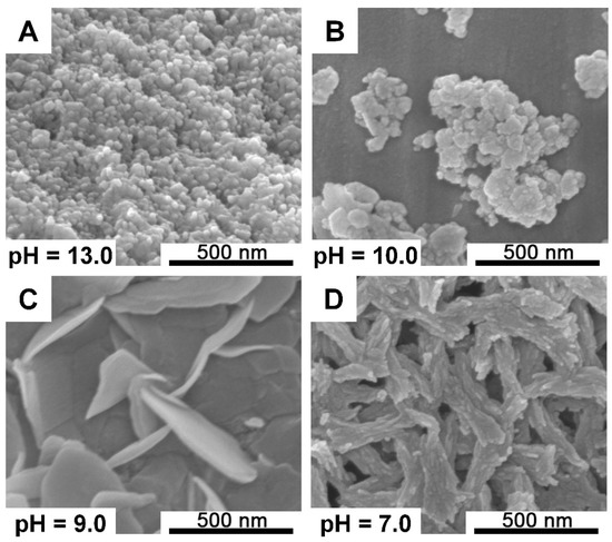 SEM images of CaP structures observed in scale-up experiments. (A) pH = 13.0; (B) pH = 10.0; (C) pH = 9.0; (D) pH = 7.0.