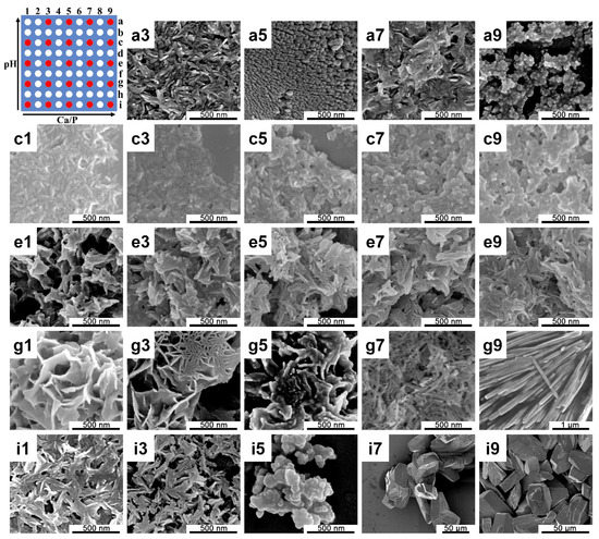 A schematic of the microreactors array and SEM images of CaP structures observed in the screening platform with a two-dimensional gradient for the pH values and the Ca/P ratio, separately. From rows i to a (bottom to top), the pH values increased from 7 to 13; from columns 1 to 9 (left to right), the Ca/P ratio increased from 0.5 to 2.0. The red spots correspond to the positions of the precipitated samples of SEM acquisition.