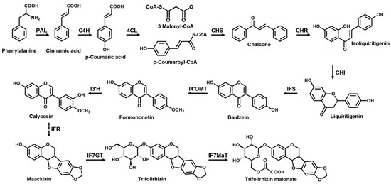 Plants produce a wide variety of secondary metabolites that are economically important as pharmaceuticals, agrochemicals, bio-pesticides, flavors, fragrances, colors, and food additives [1,2]. Sophora flavescens Aiton, the shrubby sophora, belongs to the family Fabaceae (Leguminosae) and is an important legume in Asia [3]. The root of S. flavescens, also known as Kosam in Korean (Kushen in Chinese), is commonly used as a traditional herbal medicine because of its various biological activities, including anti-cancer, anti-arrhythmic, anti-allergic, anti-inflammatory, and anti-asthmatic effects [3,4,5,6]. It has been officially listed in the Korean Pharmacopoeia and Chinese Pharmacopoeia. S. flavescens is known to produce a wide range of secondary metabolites, including flavonoids, alkaloids, triterpenoids, and pterocarpans [3]. Among them, pterocarpans—including maackiain, trifolirhizin, and trifolirhizin malonate—are isoflavonoids found in many species of Fabaceae. They have been reported to have various biological activities, such as anti-microbial, anti-cancerous, anti-inflammatory, and anti-malarial activities [7,8]. Pterocarpans comprise the second largest group of isoflavonoids after isoflavones. They primarily act as phytoalexins in leguminous plants, and also function as signal molecules in plant–microorganism interactions [7,9]. Leguminous plants are known to produce pterocarpan phytoalexins [10]. Pterocarpans of pisatin, medicarpin, and maackiain are produced in pea (Pisum sativum), peanut (Arachis hypogaea), and Sophora japonica, respectively [10,11,12,13]. Pterocarpans are formed at the last stages of the flavonoid biosynthetic pathway as a part of the isoflavonoid branch [7]. Isoflavonoids are synthesized by a legume-specific branch of the general phenylpropanoid pathway. The first product in the biosynthesis of flavonoids and isoflavonoids is chalcone, which requires an enzymatic reaction catalyzed by chalcone synthase (CHS) [14]. Isoliquiritigenin and liquiritigenin are produced from chalcones by additional legume-specific enzymes, chalcone reductase (CHR) and chalcone isomerase (CHI) [15,16]. Isoflavonoid biosynthesis is further catalyzed by isoflavone synthase (IFS) to biosynthesize isoflavanone (daidzein), which is then modified by methyltransferase (I4’OMT), hydroxylase (I3’H), reductase (IFR), glucosyltransferase (IF7GT), and malonyltransferase (IF7MaT) to form isoflavonoids (pterocarpans) (Figure 1) [17]. The flavonoid biosynthetic pathway has been elucidated, and many of the related genes have been characterized in other species [18]. Recently, putative genes involved in the flavonoid biosynthesis in S. flavescens were discovered by transcriptome (RNA-Seq) analysis [5,19]. Lee et al. [5] analyzed the contents of phenolic compounds in the leaves, stems, and roots of S. flavescens, and have identified candidate genes involved in the biosynthesis of phenolic acids and flavonoids. They have also reported the expression patterns of the biosynthesis-related genes in different organs and developmental stages.