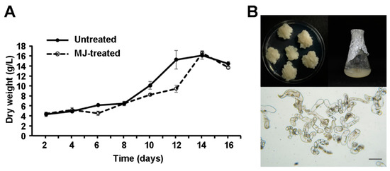 The cell suspension cultures of S. flavescens were established using the leaf-derived calli (line no. KS611, BP1429378), which had been determined as the cell line of greatest potential (callus growth) during cell line selection. The growth of the cell suspension cultures in MS1B2P medium was measured to determine the most suitable growth time point for cell harvesting. The growth curves of the cell suspension cultures treated with or without MJ were monitored by simply weighing the suspension cells (dry weight, DW) harvested at each time point. The cell suspension cultures of S. flavescens were monitored at 2 day intervals for 16 days (Figure 2). The cell suspension cultures exhibited a sigmoid growth pattern similar to those of other plant cell suspension cultures [23,34]. The pattern of the growth curve showed an initial lag phase during the first 8 days, followed by a period of exponential growth until day 14. After the exponential phase, cell cultures entered the stationary phase when cells showed a decrease in cell density. The MJ-treated cells showed a similar growth pattern to that in the untreated cells, but they displayed about 38% reduction in cell biomass on day 12 compared to the untreated cells (Figure 2A). The highest biomass of the S. flavescens cell cultures was obtained on day 14 in both untreated (16.1 g/L) and MJ-treated (16.3 g/L) cells. As shown in Figure 2B, microscopic observations of S. flavescens cell cultures exhibited cell morphology with non-embryogenic characteristics, such as irregular, longish, and multicellular aggregates in shapes [23,35,36].