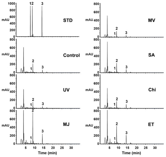 Effects of various elicitors on the production of pterocarpans (maackiain, trifolirhizin, and trifolirhizin malonate) in the S. flavescens cell cultures. Cells were pre-cultured for seven days and harvested three days after elicitation with the indicated elicitors. Samples were extracted with methanol and analyzed by HPLC. The elicitors used are as follows: UV, ultraviolet ray; MJ, methyl jasmonate; MV, methyl viologen; SA, salicylic acid; Chi, chitosan; ET, ethephon. Cells treated with 0.1% ethanol was used as a control. Chromatogram STD represents the authentic standards 1 (trifolirhizin), 2 (trifolirhizin malonate), and 3 (maackiain), with retention times of 7.88, 8.93, and 14.28 min, respectively.