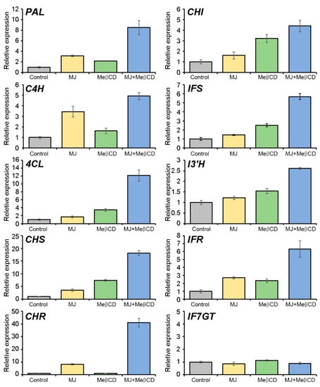 We have previously reported the identification and expression analysis of the structural genes involved in the biosynthesis of phenolic compounds, including isoflavonoids, in different organs and developmental stages of S. flavescens [5]. Likewise, Jiao et al. [42] also performed the genome-wide analysis of structural genes involved in legume-specific isoflavonoid biosynthesis, such as SfCHS, SfCHR, SfIFS, and SfIFR in S. flavescens [42]. Pterocarpans are synthesized from L-phenylalanine through the general phenylpropanoid pathway and the isoflavonoid biosynthetic pathway via a series of enzymes (Figure 1). In leguminous plants, CHS, CHR, CHI, IFS, and IFR are key enzymes involved in the isoflavonoid biosynthesis. Thus, to analyze the relationship between pterocarpan accumulation and expression of pterocarpan biosynthetic genes in the S. flavescens cells, elicited with MJ alone or together with MeβCD, qRT-PCR was performed to examine the expression of structural genes involved in the pterocarpan biosynthetic pathway (Figure 5). Among them, biosynthetic genes, such as SfPAL, SfC4H, Sf4CL, SfCHS, SfCHR, SfCHI, SfIFS, SfIF3’H, and SfIFR were up-regulated by the 50 μM MJ or 50 mM MeβCD elicitation of cells for 24 h. In addition, the co-treatment with MJ and MeβCD synergistically induced the expression of the pterocarpan biosynthetic genes. The activation of the three genes SfPAL, SfC4H, and Sf4CL, encoding PAL, C4H, and 4CL, respectively, in the phenylpropanoid pathway likely provides more precursors for flavonoid biosynthesis. Furthermore, the SfCHR3 gene was most highly induced by MJ alone (~8.1-fold) or by co-treatment with MeβCD (~41.0-fold) relative to the control. CHR is the key enzyme that catalyzes the first committed step in isoliquiritigenin biosynthesis [42,43]. This may be the reason for the high responsiveness of the SfCHR3 gene of S. flavescens cells to MJ and MJ + MeβCD. Increased CHR enzyme activity can further facilitate the production of the isoliquiritigenin precursor for isoflavonoid biosynthesis. The SfIF7GT gene was not significantly responded to with MJ and MJ + MeβCD treatments, but its basal level was high, being approximately 7.9-fold higher than that of the SfACT11 gene used as an internal control (Figure S1). Such a high-level expression of the IF7GT enzyme may result in the accumulation of trifolirhizin through the catalysis of maackiain glycosylation. These results thus indicate that MJ alone or co-treatment with MeβCD induces the transcriptional activation of multiple structural genes involved in pterocarpan biosynthesis, thereby leading to an enhanced pterocarpan production in S. flavescens cells.