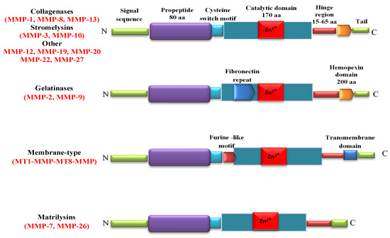 Matrix metalloproteinases (MMPs) are Zn2+ endopeptidases. They contain about 80 types of amino acids, a catalytic metalloproteinase domain (containing about 170 amino acids), a binding type of the special peptide or hinge-shaped region of variable length and a hemopexin stationary domain, with about 200 amino acids [19]. A definition of MMPs is based on their substrate specificity, structural organization, and cellular location. From a chemical point of view, the MMPs include collagenases (MMP-1/collagenase-1, MMP-8/collagenase-2, and MMP-13/collagenase-3), stromelysins (MMP-3/stromelysin-1, MMP-10/stromelysin-2, and MMP-11/stromelysin-3), gelatinases (MMP-2/gelatinase-A and MMP-9/gelatinase-B), membrane-type MMPs such as transmembrane MMP-14, MMP-15, MMP-16, MMP-24, membrane-anchored MMP-17, and MMP-25, and matrilysins (MMP-7/matrilysin-1 and MMP-26/matrilysin-2 [20] (Figure 1).