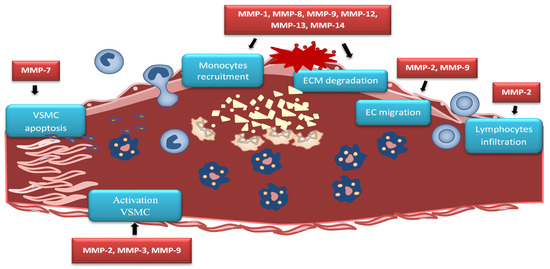MMPs have been found to be involved in vascular wall remodeling and atherosclerosis development through inflammatory activation and endothelium dysfunction [88]. The dysfunction of endothelium is characterized by proinflammatory and prothrombic state; the action of the endothelium is shifted toward reduced vasodilation, and the phenotype changes from antiadhesive to proadhesive [89]. Damage of endothelial junctions results in enhanced endothelial permeability, which facilitates infiltration of various inflammatory mediators. Activation of endothelial MMP-2 can induce endothelial dysfunction and disintegrity [90]. Recruited vascular wall cells can remodel the surrounding extracellular matrix through MMPs that affect migration, proliferation, and apoptosis of endothelial cells and VSMCs [91].