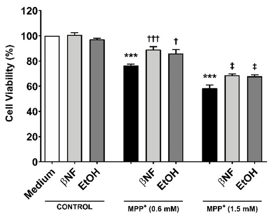 2.1. βNF and EtOH Treatment Reduce the Loss of Cell Viability by MPP+