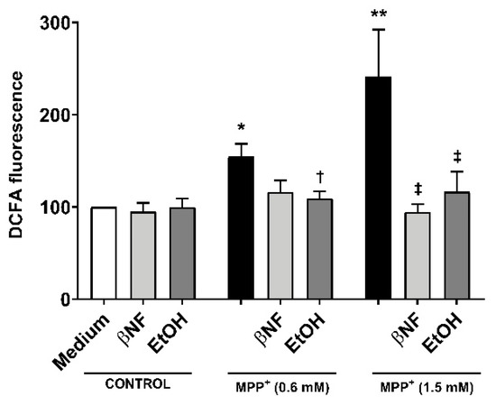 Figure 3. Reactive oxygen species (ROS) production by MPP+ was decreased in cells treated with CYP inducers. MPP+ treatments increased the production of ROS in SH-SY5Y cells at both concentrations. When cells were treated with βNF or EtOH prior and during exposure to MPP+ (see Table 1 for treatment details), ROS production was decreased. Columns represent the percentage related to control (medium) samples of DCFA fluorescence, and data are presented as mean ± SEM of independent cell culture preparations (n ≥ 5). ** p < 0.01, * p < 0.05 vs. βNF or EtOH; p < 0.05 vs. MPP+ 0.6 mM; p < 0.05 vs. MPP+ 1.5 mM, two-way ANOVA followed by Tukey post-test.