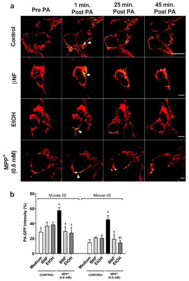 Figure 4. MPP+-induced damage to mitochondrial fusion dynamics in SH-SY5Y cells was reversed by βNF and EtOH. (a) Representative confocal images of SH-SY5Y showing the PA-GFP fluorescent spread over the time. Pictures are a combination of red channel for the mitochondrial reporter and the green channel for PA-GFP. Arrowheads point the photo-activated area. Scale bar: 10 µm. (b) PA-GFP percentage intensity in the photo-activated area at minutes 25 and 45 post-photoactivation. Mitochondrial fusion dynamics after treatment with βNF + MPP+ (0.6 mM) or EtOH + MPP+ (0.6 mM) returned to control values. Intensity in the green channel before photo-activation was taken as 0%, while intensity in one-minute post photo-activation was considered as 100% intensity. Columns represent mean ± SEM of independent cell culture preparations (n ≥ 3). * p < 0.05 vs. medium; †† p < 0.01, p < 0.05 vs. MPP+ 0.6 mM, two-way ANOVA followed by Tukey post-test.