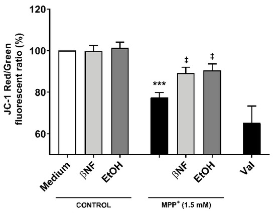 Figure 5. Changes in ψm by MPP+ were restored by βNF and EtOH treatments. SH-SY5Y cells were treated with MPP+ (1.5 mM) and JC-1 was used to study the ψm. In control conditions, JC-1 accumulated inside the mitochondria, emitting red fluorescence. When the Ψm was disrupted, JC-1 accumulated in cytoplasm, emitting green fluorescence. Valinomycin (Val), which permeabilizes the mitochondrial membrane to potassium, dissipated the mitochondrial electrochemical potential and was used as a positive control to prevent JC-1 aggregation. Data represent the red/green ratio of treated cells and are depicted as a percentage of control samples of independent cell culture preparations (n ≥ 3). *** p < 0.001 vs. βNF or EtOH; p < 0.05 vs. MPP+ 1.5 mM, two-way ANOVA followed by Tukey post-test.