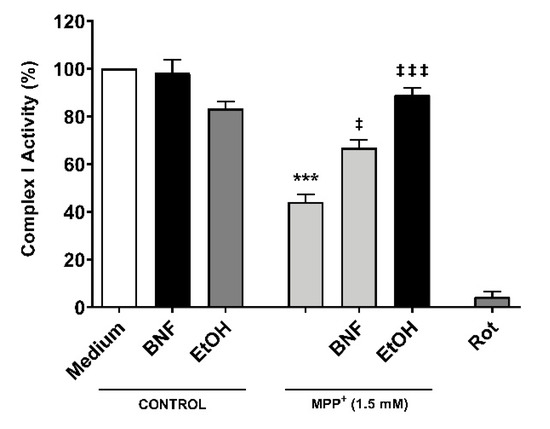 Figure 6. Reduction of mitochondrial complex I activity by MPP+ was partially avoided with βNF and EtOH pre-treatments. SH-SY5Y cells were pre-incubated with either inducer for 48 hours prior exposure to MPP+ in the moment of data acquisition. Rotenone (Rot) was used as control for NADH reduction by complex I. Columns represent the percentage of complex I activity of each group (see Methods) and represent the mean ± SEM of independent cell culture preparations (n = 3). *** p < 0.001 vs. βNF or EtOH; ‡‡‡ p < 0.001, p < 0.05, vs. MPP+ 1.5 mM, two-way ANOVA followed by Tukey post-test.