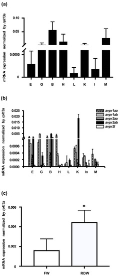 In addition to the expression in the brain, avp expression has also been reported in the bone marrow and testes [40,41], suggesting it has both central and peripheral effects. In the present study, zebrafish avp showed ubiquitous expression, but it was most highly expressed in the brain (Figure 1a). This result is in agreement with the fact that Avp is known to be mainly produced by the hypothalamic neurons. The wide distribution pattern of avp expression in many tissues, including the eyes, gills, heart, kidney, and muscle, is similar to distributions found in Japanese quail, chicken, lamprey, and shark [42,43,44,45]. This wide distribution is also in line with the idea that Avp may regulate a variety of physiological functions, such as muscle contraction, reproduction, salt acclimation, and social behavior [12,46,47,48,49]. Furthermore, we found that five Avp receptors were widely expressed in various tissues (Figure 1b). The broad distribution of Avp and its receptors in mammalian and non-mammalian tissues suggests that multiple functions of Avp are conserved among vertebrates.