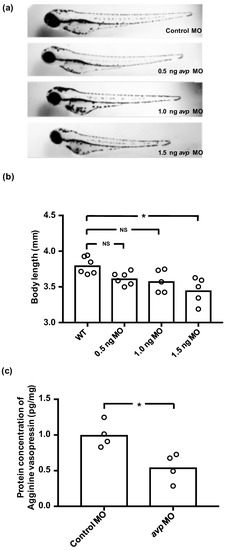 Effects of downregulating Avp by morpholino injection in zebrafish embryos. (a) Comparison of morphology and body length at 3 dpf for uninjected wild-type larvae (WT) and those injected with various doses of Avp morpholino (MO) at 1–2-cell stage. (b) Histogram shows body length with individual measurements indicated by open circles. (c) Relative protein level of AVP at 3 dpf was assessed by enzyme-linked immunosorbent assay (ELISA) in larvae injected with 1 ng of control morpholino or Avp morpholino (AVP MO). Asterisk indicates a significant difference from uninjected wild type (b) or control (c), according to one-way ANOVA, Tukey’s pair-wise comparison, and Student’s t-test, p < 0.05. N.S. indicates not significant.