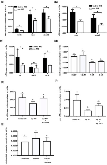 In zebrafish, at least three types of ionocytes were identified in the skin/gills: Na+-K+-ATPase-rich cell (NaRC), H+-ATPase-rich cell (HRC), and Na+-Cl− cotransporter cell (NCC), which are responsible for calcium uptake, acid/base balance, and chloride uptake, respectively [28,32,33]. mRNA expression levels of ion transporters that are found in NCC cells (ncc2b, clc-2c, and nbce1b) were significantly downregulated by avp MO (Figure 3a); gene expression of the NaR cell-related genes (ecac and pmca2) was also downregulated by avp MO (Figure 3b). Among HR cell-related genes, mRNA expression of ha and ae1b were decreased significantly in the morphants, while nhe3b expression did not change compared with control MO-injected embryos (Figure 3c). To further test the effects of Avp on mRNA expression of ionocyte-related genes, we incubated the embryos with Avp antagonist SR49059 (for receptor type1A), SSR149415 (for receptor type 1B), and Tolvaptan (for receptor type2) and checked the mRNA expression of ncc2b. The ncc2b expressions were significantly downregulated by antagonist SR49059 treatments (1 and 5 μM) (Figure 3d), while SSR149415 and Tolvaptan did not significantly affect ncc2b expressions (data not shown). In addition, we co-injected avp MO with Avp cRNA and found that Avp cRNA rescued the mRNA expressions of ha (Figure 3e) and ncc2b (Figure 3f), while the nhe3b mRNA expression was not affected by avp MO and Avp cRNA (Figure 3g).