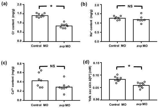 Effects of downregulating Avp on ion content or efflux at 3 dpf. Embryos were injected with control morpholino (Control MO) or antisense avp morpholino (avp MO) at the 1–2-cell stage. Mean values for whole body Cl− (a), Na+ (b), and Ca2+ (c) contents of 8 samples (10 embryos each) are shown in the histograms, with individual values indicated by white circles. Cl− content was determined by spectrophotometer at 460 nm upon reaction with mercury thiocyanate and iron alum. Na+ and Ca2+ contents were measured by atomic absorption spectrophotometry. H+ flux gradients (d) between skin surface on yolk sac and nearby buffer (by a 10 mm-distance horizontally) were determined by the scanning ion-selective electrode technique (SIET). A positive H+ gradient (Δ[H+]) representing acid secretion was recorded at the surface of the yolk sac. Values are means (n = 8–9). Asterisks indicate significant differences from control, according to Student’s t-test, p < 0.05. NS indicates no significant difference.
