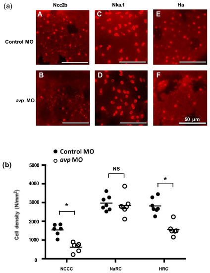 Effects of morpholino-mediated downregulation of AVP on ionocyte cell density in 3 dpf embryos. (a) NCC (A,B), NaR (C,D), and HR (E,F) cells were visualized by immunofluorescence labeling, using antibodies against NCC2b (A,B), NKA.1 (C,D), and HA (E,F), respectively at 3 dpf. Scale bars represent 50 μm. Mean cell density of ionocytes (b) is shown as a solid line with individual values indicated by black-filled circles for control morpholino-injected larvae or white-filled circles for antisense Avp mopholino-injected larvae. Values are means (n = 6–8). Asterisks indicate significant difference from control, according to Student’s t-test, p < 0.05. NS indicates no significant difference.