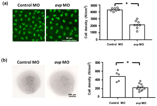 Effects of morpholino-mediated downregulation of AVP on ionocyte precursor cell density. Epithelial stem cells at 3 dpf (a) and ionocyte progenitors at the tail-bud stage (b) were labeled by p63 antibody and foxi3a antisense riboprobe, respectively. Mean cell densities of p63- or foxi3a-expressing cells are indicated by bars with individual values shown as white-filled circles. Values are means (n = 5–12). Asterisks indicate a significant difference from control group, according to Student’s t-test, p < 0.05.