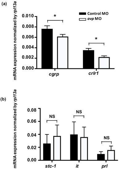 To investigate if Avp functions with other hormones to modulate Cl− balance, we knocked down Avp protein expression and measured expression of genes for calcitonin gene-related peptide (cgrp), calcitonin receptor-like 1 (crlr1), stanniocalcin-1 (stc-1), isotocin, and prolactin, which have all been reported to participate in Cl− balance in zebrafish [36,37,38,39]. The expression levels of mRNA encoding cgrp and its receptor crlr1 were downregulated in Avp morphants (Figure 7). In contrast, expression of genes encoding Stc-1, isotocin and prolactin were not affected by avp MO (Figure 7).