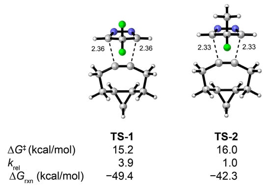 Transition-state geometries and calculated Gibbs free energies of activation (ΔG‡) and reaction (ΔGrxn) computed at the M06-2X/6-311++G(d,p)//M06-2X/6-31G(d) level of theory for the Diels–Alder reactions of 4,4-difluoro-4H-pyrazole (TS-1) and 4-fluoro-4-methyl-4H-pyrazole (TS-2) scaffolds toward endo-bicyclo[6.1.0]non-4-yn-9-ylmethanol (BCN) lacking the 9-hydroxymethyl group. The lengths (Å) of forming bonds are shown. Values of krel were calculated at 298 K with the Arrhenius equation.