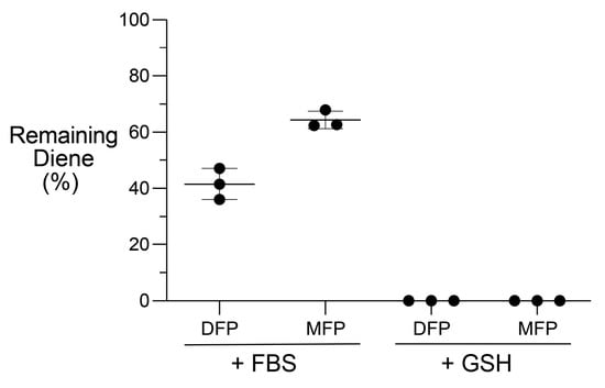 A solution of MFP (0.1 mM) or DFP (0.1 mM) was prepared in phosphate-buffered saline containing fetal bovine serum (10% v/v) and dimethyl sulfoxide (DMSO) (2% v/v). Absorbance was measured at 335 nm (MFP) or 355 nm (DFP) with the baseline corrected to the solution without a diene. The solution was then incubated at 37 °C for 8 h, after which another absorbance reading was taken to determine the amount of remaining diene. Values are the mean ± SD from triplicate assays.