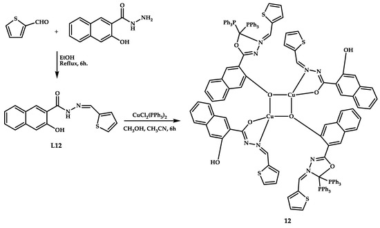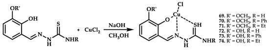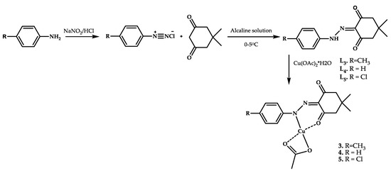 Copper coordination compounds 3–5 with Schiff bases as ligands were obtained by condensation of 5-dimethylcyclohexane-1,3-dione and a hydrazine derivative by Shoair et al. [39] (Figure 2).