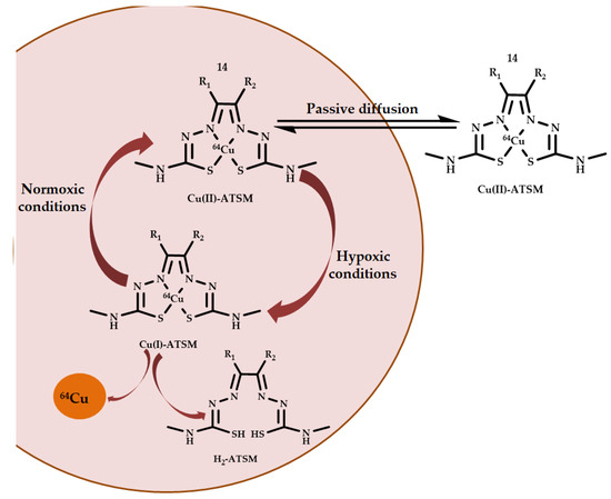 Drug accumulation in hypoxic areas is associated with redox transitions of Cu(II)/Cu(I). Labeled with a radionuclide tag, Cu-ATSM 14 penetrated into cells by passive diffusion and underwent glutathione reduction. Under normoxic conditions, the labile coordination compound Cu(I) is oxidized by intracellular oxygen to the coordination compound Cu(II) and leaves the cell. In contrast, under hypoxic conditions, the Cu(I) coordination compound dissociates into a ligand and a metal ion, which binds to intracellular chaperone proteins leading to the accumulation of a radionuclide in hypoxic regions of tumors. The oxidation process of Cu(I) is so fast that a noticeable intracellular reduction of Cu(II) ATSM occurs only in hypoxic (tumor) cells, while the drug leaves healthy cells without any changes [52] (Figure 6).