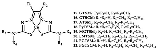 Anjum et al. recently reported eight thiosemicarbazido-based Cu(II) complexes, Cu-ATSM analogues 15–22, with promising antitumor activity [54] (Figure 7).